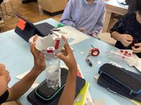 4年生の理科の授業で、改良した水ロケットを飛ばす実験を行っていました。子供たちは、「ずごい!こんなに飛ぶようになったよ!」と大興奮です。ペットボトルの中に入れる水の量にもこだわり、空気の力を最大限生かすための方法を模索していました。思い通りの飛距離が出せ、歓声を上げて喜んでいました。