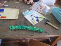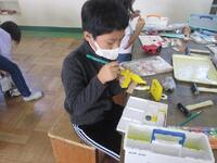 3年生図工の授業は、木材に色塗りをしてパーツを釘で打ち付けています。様々な昆虫や動物が完成してきています。釘の打ち方によってパーツが上手に動くような仕掛けもできています。素晴らしいカメレオンを見付けました。