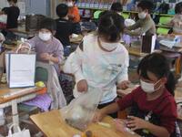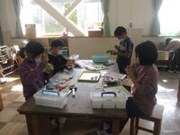 1年生の生活は、校庭で拾ってきたどんぐりやまつぼっくりを使ってコマや動くおもちゃを作っています。ロウを溶かして接着させたり、どんぐりに穴をあけて楊枝を刺したり、自分でどんどん作業を進めています。出来上がりが楽しみですね。