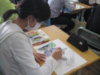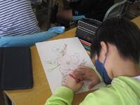 6年生図工の授業の様子です。タブレットで撮影した花を丁寧に色塗りしています。色の濃淡を色鉛筆で表現し、とても上手に制作しています。
