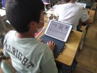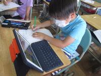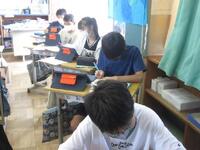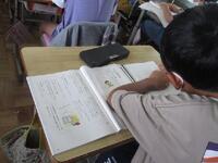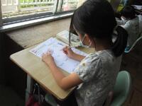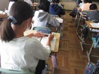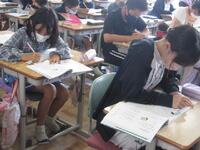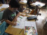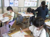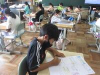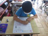 4年生は1桁で割る割り算の単元テストに取り組んでいます。できる問題から確実に行い、裏面の文章題や応用問題もしっかりと文章を読み解いてから解答を導き出しています。