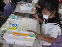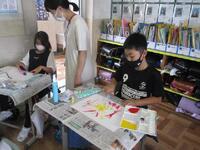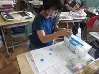4年生図工の授業の様子です。ビー玉、カップの底、スポンジ、ペットボトルキャップ、ストロー、歯ブラシなど、筆以外のものを使って宇宙空間を描いています。自分が想像する宇宙をそれぞれが表現しています。