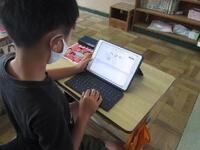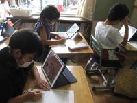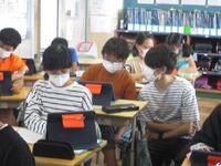 6年生算数の授業の様子です。3/7×□の□に小数、分数、整数など全部で7つの数字を入れた時に、この式の答えが大きくなる順番を考えるという問題に取り組んでいます。小数を分数にしたり、分数を小数にしたりして20分間考えています。