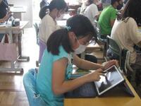 2年生生活の授業の様子です。ミニトマトの生長を写真に撮り、じっくりと観察をしています。つぼみや花の色や形、花びらの数など以前と比べて変化したところをワークシートにまとめています。