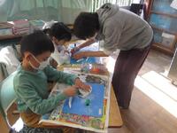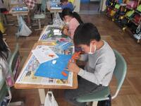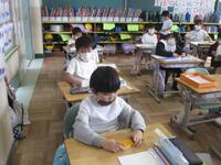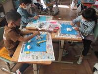 1年生図工の授業の様子です。自分が今まで頑張ったことを「ご褒美メダル」として紙粘土で制作しました。今日はそのメダルにマジックで色塗りをしています。絵の具と違って少し塗りにくそうですが、粘り強く取り組んでいます。