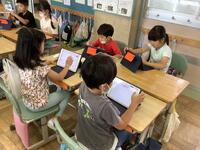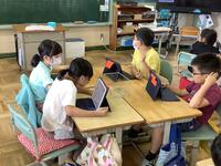 2年生の生活科の授業の様子です。プールからヤゴをとってきて、その観察をしていました。体のつくりなどを観察しながら、1人1台端末を活用してシートにまとめていました。