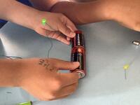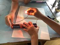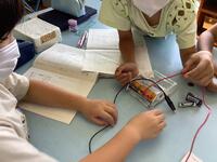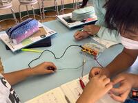 4年生理科で豆電球をもっと明るくすためにという目標で実験したところ、それぞれの班が電池を直列につなぐことを発見しました。
