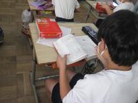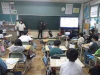 4年生外国語活動では、音を聞いて英単語を読める学習をしています。先生やALTが発音するアルファベットや単語の音を聞きながら、教科書の絵の中にある英単語を見付け、発音しています。「STOP」や「OPEN」など素早く見付けていました。