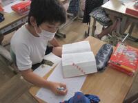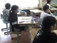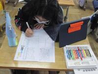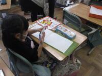 1年生算数の授業は、長さ比べの学習です。どのように長さを比べたらいいかを考えています。長さの違う鉛筆は、端をそろえる、曲がっているひもは、伸ばしてから端をそろえる、葉書や紙の縦と横の長さは、折って調べるなど、たくさんの方法があることが分かりました。
