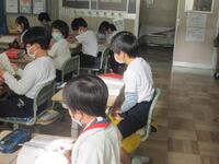 3年生国語の授業は、国語辞典を使って「モチモチの木」に出てくる難しい言葉の意味調べをしています。「おくびょう」「きもをひやす」「さいそく」など、辞書を引いてひとつずつワークシートに意味を書いて理解しています。