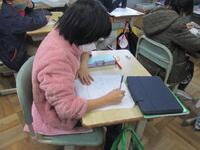 5年生書写の授業は、書き初め練習です。「温かな心」という文字を書き初め用紙に練習しています。今日は机の上での練習なので、バランスが難しそうです。冬休みは自宅で正座して挑戦してほしいと思います。