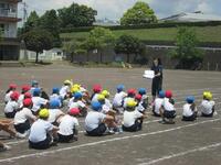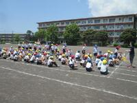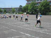 4年生体育の授業の様子です。徒競走のレーンとレース順を丁寧に確認して整列しました。「位置について」のコールで気を付け、「用意」のコールで片足を引いて構えることも練習しました。