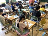2年生「国語」の様子です。お互いに作文を見合っていました。そして、良いところを伝え合う、ということをしていました。