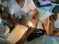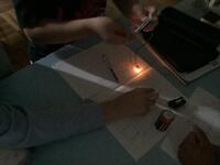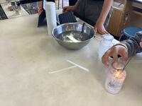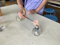 6年生の理科の授業の様子です。「ヒトは呼吸で酸素を出しているか」という課題に取り組んでいました。呼気を水上置換法で集め、その呼気を集めた集気びんの中でろうそくが燃え続けるか確かめていました。結果は、少し燃えてから消えました。子供たちは、このことから課題の答えについて考えていきました。