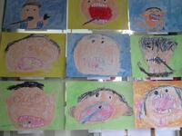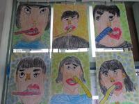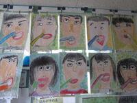 1年生の廊下には歯磨きをしている自画像が掲示されました。画用紙いっぱいに表情豊かな顔が書かれています。背景も工夫されて塗られています。
