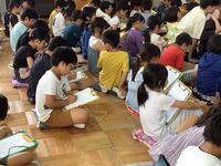 下絵を終えた子供たちは、彫刻刀をつかっての彫る作業に取り組んでいます。線彫りを中心に、白く表したいところは、丸刀をつかってたくさん掘り進めています。