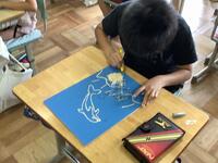 4年生の図画工作の授業の様子です。好きな生き物を描いた木版画に取り組んでいます。
