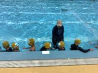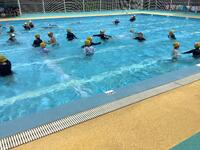 1年生は、小学校のプールにも少しずつ慣れてきました。水の中を移動する運動遊びやもぐる・浮く運動遊びに取り組んでいます。