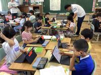 3年生の教室を訪れると、学校ブログをみんなで見ていました。