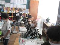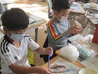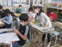 3年生図工の授業は、紙版画の制作です。テーマは「芋掘りの楽しさが伝わる体の動き」です。まずは、まゆげ、白目はな、耳、口、髪の毛など、顔の表情から作っています。そしてどのような体に動きにするかについて先生がいくつかのヒントを与えていました。どんな作品ができるか楽しみです。