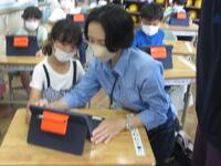 1年生がタブレットの指紋認証を設定しました。パスコードを入力しなくても親指ひとつですぐに使えることができるようになりました。ICT支援員の斎藤さんにもサポートしていただきました。設定後はメタモジで塗り絵の活動をしました。