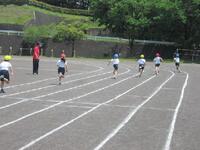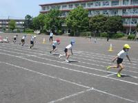3年生体育の授業の様子です。徒競走のレースとレーンを確認し、実際に曲走路のコースを走りましたが、コースを外れることなくゴールしました。
