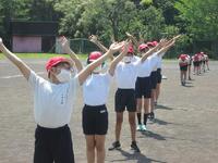 6年生体育の授業の様子です。5年生と合同で組体操の練習です。電位ホイッスルに合わせて一斉に動いていきます。指先までしっかりと伸びていてきれいです。
