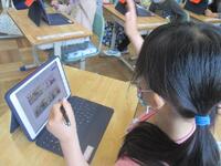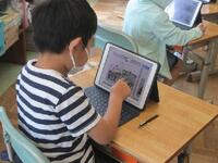 1年生生活の授業の様子です。安全な登下校について学習していますが、タブレットに提示された2つの絵を見て正しい登下校の方法を選択しています。早速メタモジを使いました。