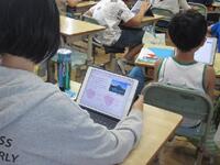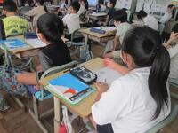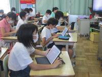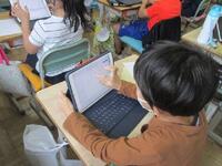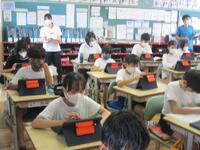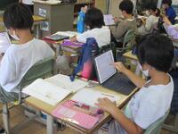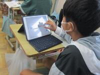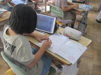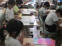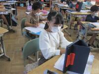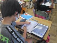3年生算数の授業の様子です。大きい数の「たしかめテスト」を行い、タブレットに送られた模範解答を見ながら自分で丸付けとやり直しをしています。先日学習した、10倍、100倍すると0がいくつ増えるかについても理解を深めて問題を解くことができていました。