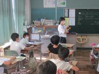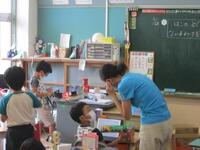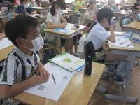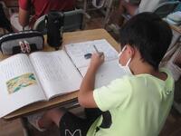 6年生算数の授業の様子です。円の面積を求める公式を用いて、様々な図形の面積を求める問題に取り組んでいます。どんな図形が隠されていて、どの図形からどの図形を引けばいいかを考えることで求められそうです。授業の終わりには校長先生から応用問題の宿題が出されました。明日の授業が楽しみです。