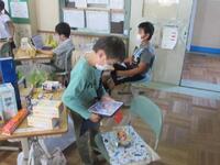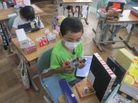 1年生算数の授業の様子です。机の上には様々な形のたくさんの箱が用意されています。箱の特徴や形から写真を撮りながら仲間分けをしています。どのように仲間分けできるか、楽しみですね。