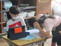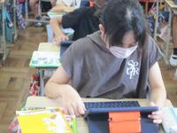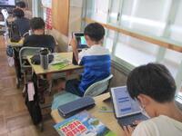 5年生社会の授業の様子です。200カイリとは何かについて個々で調べて理解をし、200カイリを設定することによるメリットとデメリットは何かについて各自の意見をまとめています。