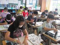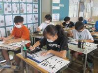 6年生書写の授業の様子です。席書コンクールに向けての清書です。紙からはみ出さない、文字が重ならない、にじまないように慎重に、丁寧に集中して無言で書いています。