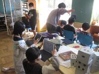 4年生算数の授業は、図形の面積について学習しています。1平方センチメートルの正方形が複雑に組み合わされた図形の総面積を求めています。中には図形に様々な三角形が含まれていたり、空洞があったりしますが、形を変えたり、うまく組み合わせたりして解答していました。