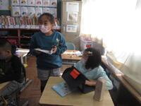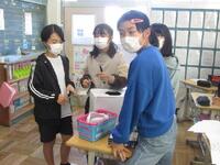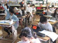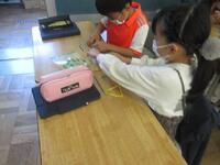 4年生外国語活動の様子です。文房具屋の店員とお客さんに分かれて、買い物をするやりとりを英語で会話しています。商品が売れていくと品物がなくなるので、お客さんに対して「申し訳ありません」と謝る場面も見られました。
