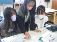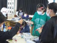 6年生理科の授業の様子です。電気と私たちの暮らしの単元の中で、手回し発電機で電気を作っています。作った電気を豆電球やモーター、電子オルゴールにつないで通電しているか確かめています。