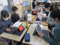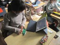 1年生図工の授業は、折り紙でクリスマス飾りを作っています。タブレットで折り方の画像を見たり、先生に聞いたりして、サンタクロース、ブーツ、帽子、ベル、プレゼント、トナカイなど様々な作品に挑戦し、完成すると「できた!」と大喜びしていました。