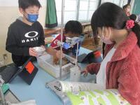 3年生理科の授業の様子です。音が大きい時と小さい時でもののふるえ方はどのように違うかについて、トライアングルに付けた付箋とゴムのふるえ方の動画をじっくりと観察して考察を深めました。