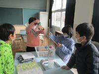 4年生理科の実験の様子です。水が冷えて氷になるときの水の温度や様子について、時間を計りながら観察しています。器具を整えてから徐々に塩や水を加えながら、温度や体積の変化に注目してまとめていきます。