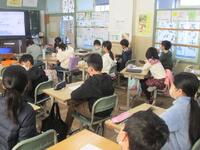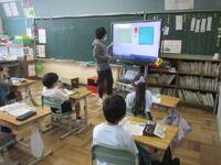 1年生算数の授業の様子です。たくさんの魚が泳いている絵を見て、数を数えていますが、早くしかも間違いなく数えるいい方法がないかを追究しています。10匹ずつまるで囲んでいけば、分かりやすいという意見が出ました。そして、10が10個で100になることを理解しました。