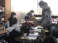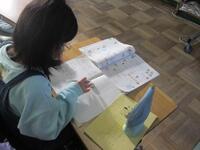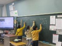 3年生算数の授業の様子です。3桁×2桁のかけ算について、友達同士で教え合ったり、計算方法を確かめたりしています。筆算に間違えがないことを確認してから、代表者がみんなに分かるように黒板に書いています。