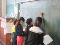 3年生の算数は3桁×2桁のかけ算です。いくつかの問題が先生から出題され、位に気を付けて筆算で確実に解きました。みんなが計算方法を確認できるように、何人かが黒板に書いています。