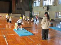 1年生体育の授業の様子です。3段の跳び箱を使って開脚跳びに挑戦しています。怖がることなく、自分の腕でしっかりと体を支えて上手に跳び越していました。着地も手を広げてバランスをとってぴったりと止まることを意識しました。