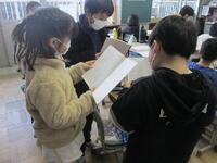 2年生算数の授業の様子です。大量に集めたペットボトルキャップをどのように数えたらいいかを追究しています。10個×10列の100個のまとまりを作れば数えやすいようです。100個のまとまりが23個、10個のまとまりが4個、余りが6個でした。さあ、合計はいくつかな。