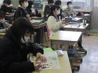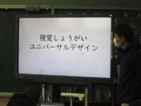 4年生国語の授業は「さわっておどろく」の単元です。「視覚しょうがい」「ユニバーサルデザイン」といったキーワードが先生から提示され、それぞれどのようなことなのかについて考えています。これから授業では点字について触れていきます。