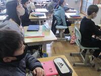 2年生体育の授業は縄跳びです。無駄な力を使わずにリラックスした状態で長い時間前方順跳びができるようになってきて、確実に技能が向上しています。また、前方かけ足跳びもリズムよくできていました。たくさん跳んで体がポカポカになりました。