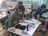 5年生書写の授業の様子です。「考える子」という4文字を書いていますが、4文字のバランスに気を付けています。また、「え」と「る」の平仮名の筆使いがかなり難しそうです。かご書き、なぞり書きをして感覚をつかんでいます。