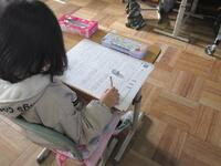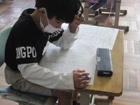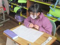 1年生の国語定着度テストの様子です。テストは2枚ありますが、1枚は言葉や漢字、聞き取りに関する問題です。もう1枚は文章を読んで答える問題です。文章をしっかりと読み込んで、集中して取り組んでいました。