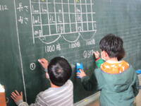 2年生算数の授業は、長さの学習です。1m=100㎝ということをものさしを使ってまず確認しました。その後、30㎝+30㎝+30㎝+25㎝が何センチになるか、何メートル何センチになるかを計算しました。1ḿの長さの感覚がなんとなく分かりました。