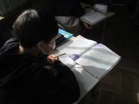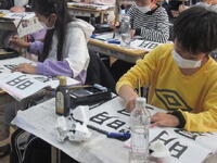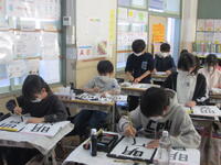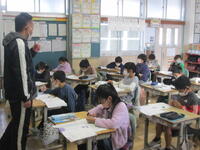 4年生書写の授業の様子です。「明星」という文字を練習しています。どちらの漢字も止めて折れるところがポイントのようです。また、2つの漢字のバランスにも気を付けて書いています。みんな無言で集中して取り組んでいます。
